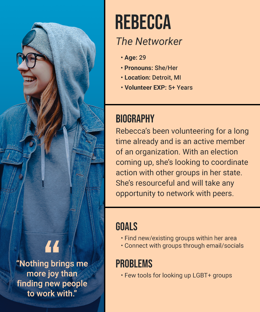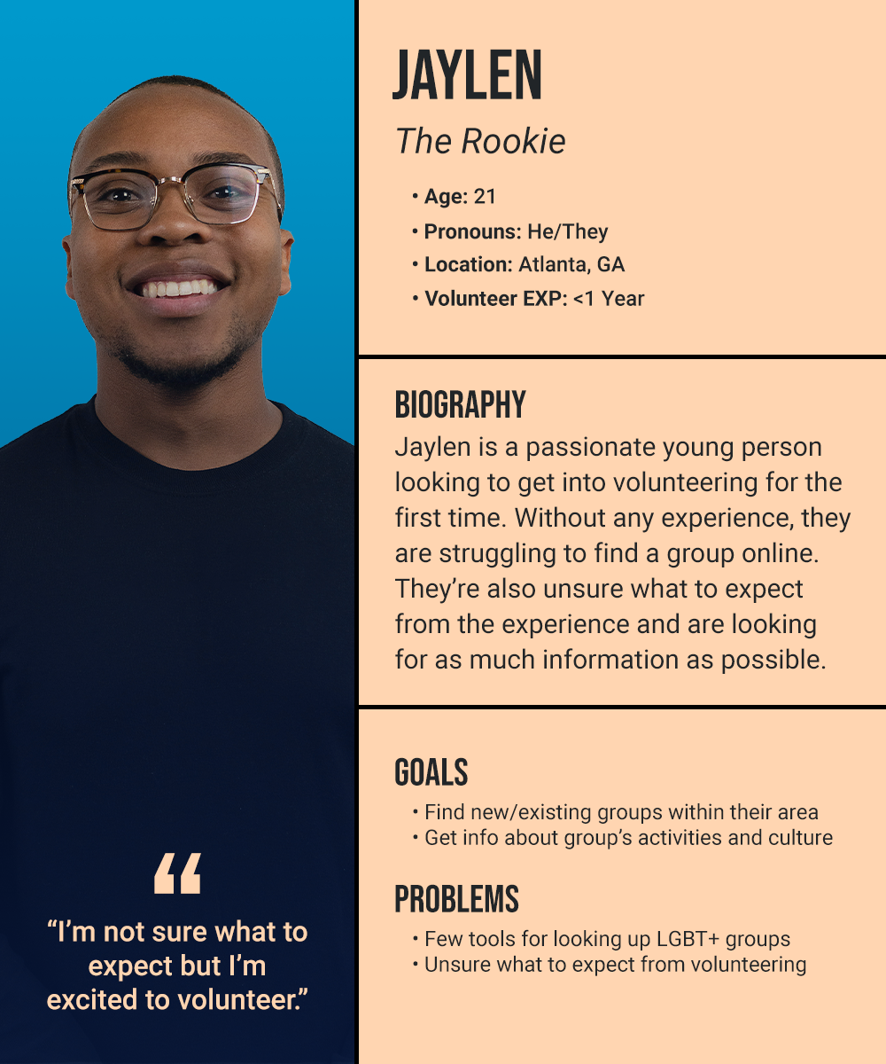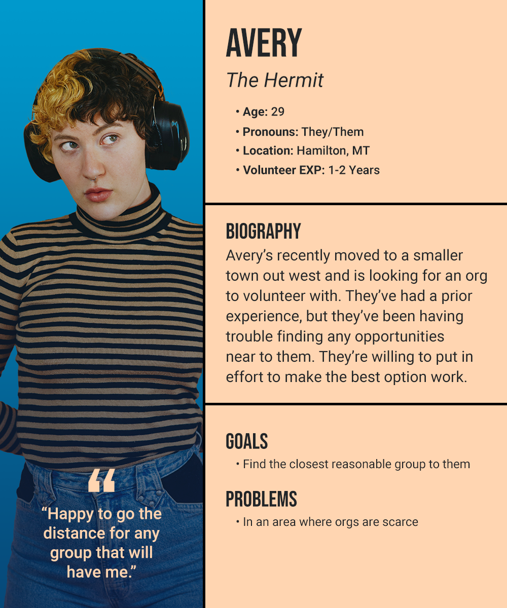 Volunteers, and their organizations are diverse in size, spectrum, and reach. No two organizations are alike, and neither are the volunteers that make up the movements, culture, and effort of an organization. The team came together to create four distinct user personas. Each with their own unique struggles, goals, and backgrounds.