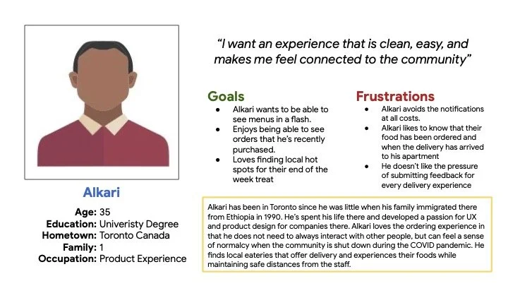 Synthesizing the data from the research interviews I conducted, I created two distinct personas, Alkari and Melody. Both personified the two main groups I was aiming. Solo Users and Group order Users. These painted a picture of who I would be designing for, what they are using ordering apps for, and how I can design a better mobile ordering experience for each.