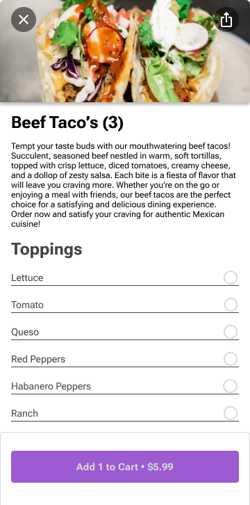 I learned how to design my own design system. I created components, live mock ups, and how to conduct user testing. Using a design system saves time when designing, and ensures continuity when making products. I learned that I am capable of designing fun, engaging experiences for users that also are useful. This project gave me a great understanding of what it means to be a UX designer professionally. I learned to embrace discovery, empathize with users, find what works, and how I can design and solve specific concerns users have in the mobile ordering industry.